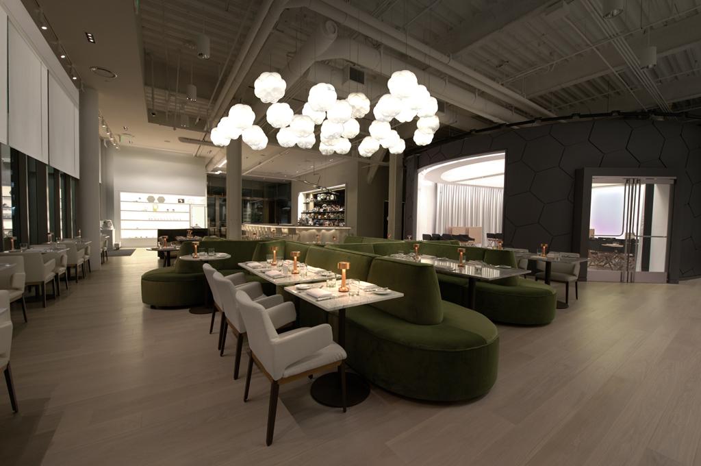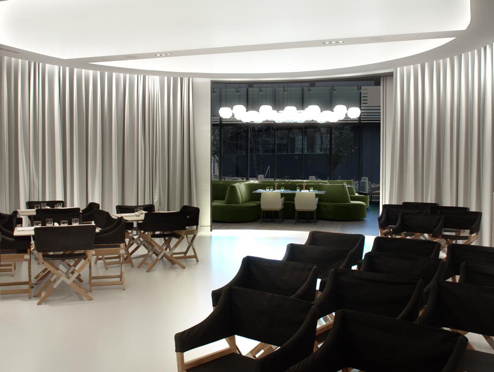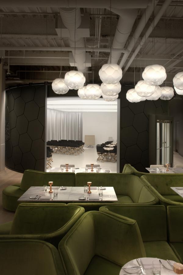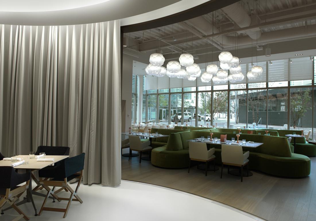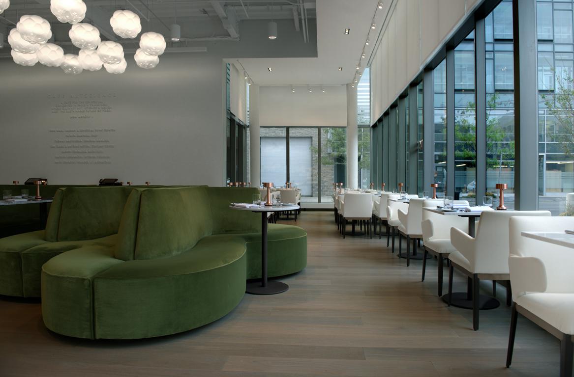 From dawn to dusk, this venue is on the way to becoming the essential hub for Boston's clever minds. The bar designed like an undulating veil of white cement, serves breakfast as well as experimental cocktails from noon to evening. The tables are used for professional meetings as well as to sample gourmet menus. The sofa, a huge ribbon of green velvet, is a synonym for comfort and encounters.