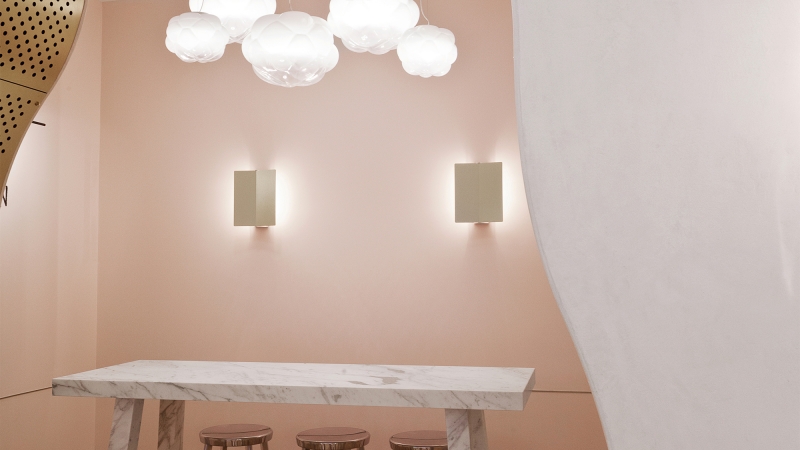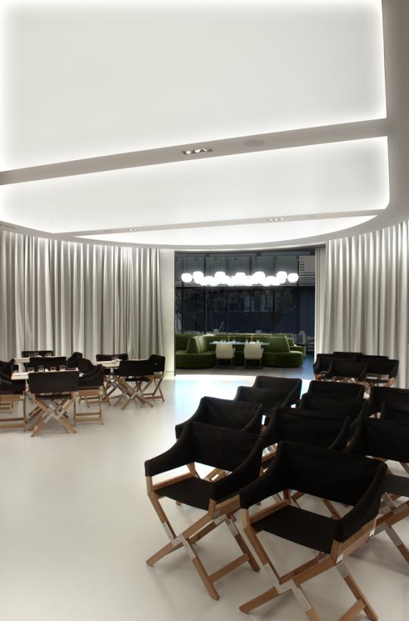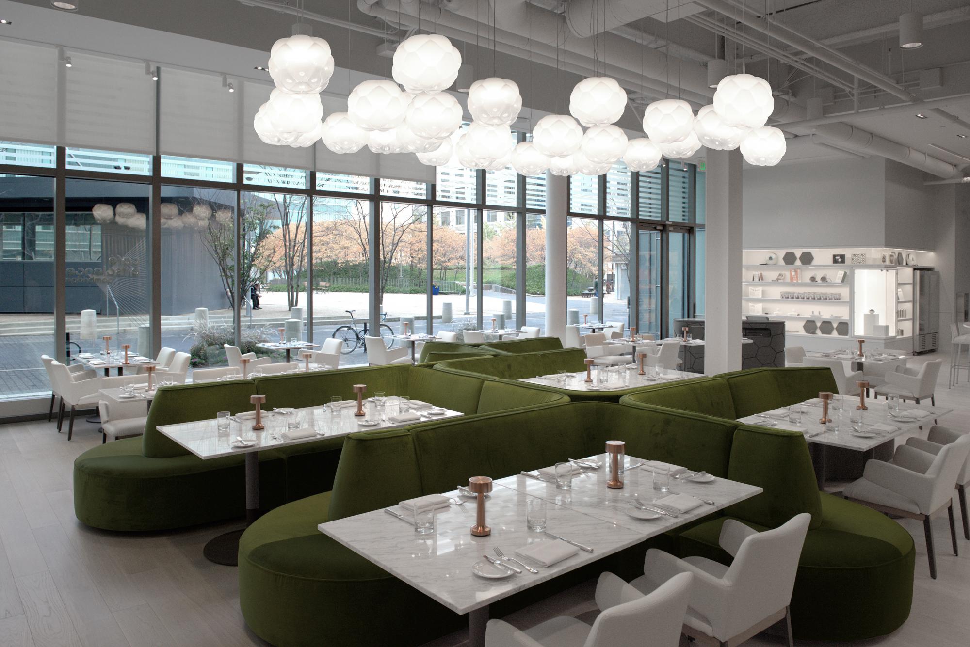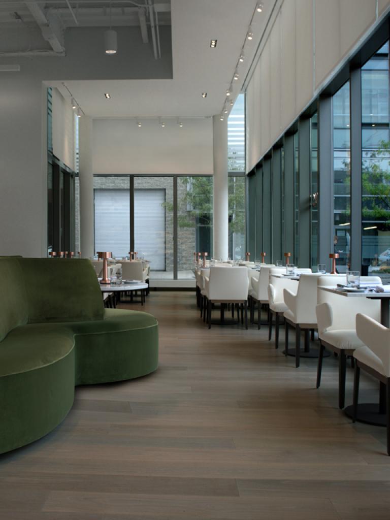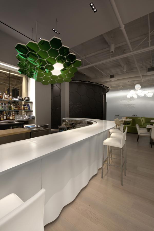 From dawn to dusk, this venue is on the way to becoming the essential hub for Boston's clever minds. The bar designed like an undulating veil of white cement, serves breakfast as well as experimental cocktails from noon to evening. The tables are used for professional meetings as well as to sample gourmet menus. The sofa, a huge ribbon of green velvet, is a synonym for comfort and encounters.