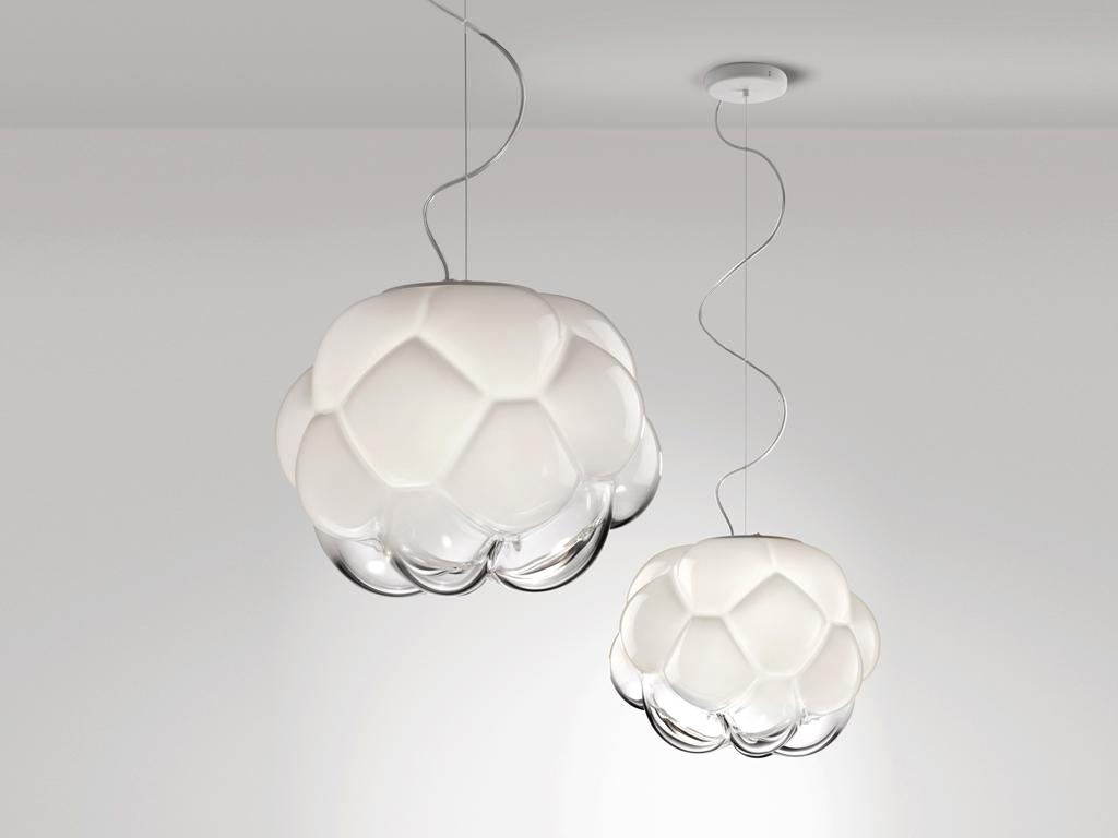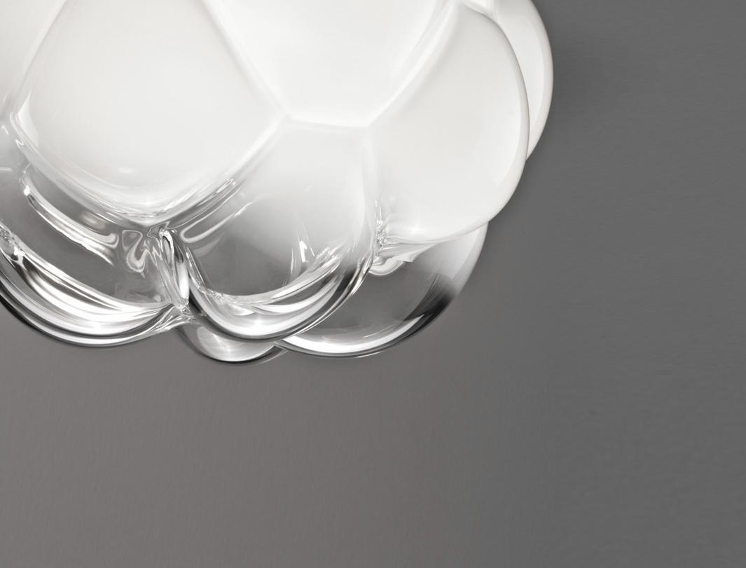 Cloudy, available as a suspension lamp or light fitting, features gradient white blown glass and die-cast aluminium structure. It is lit by high-power LED lamps.