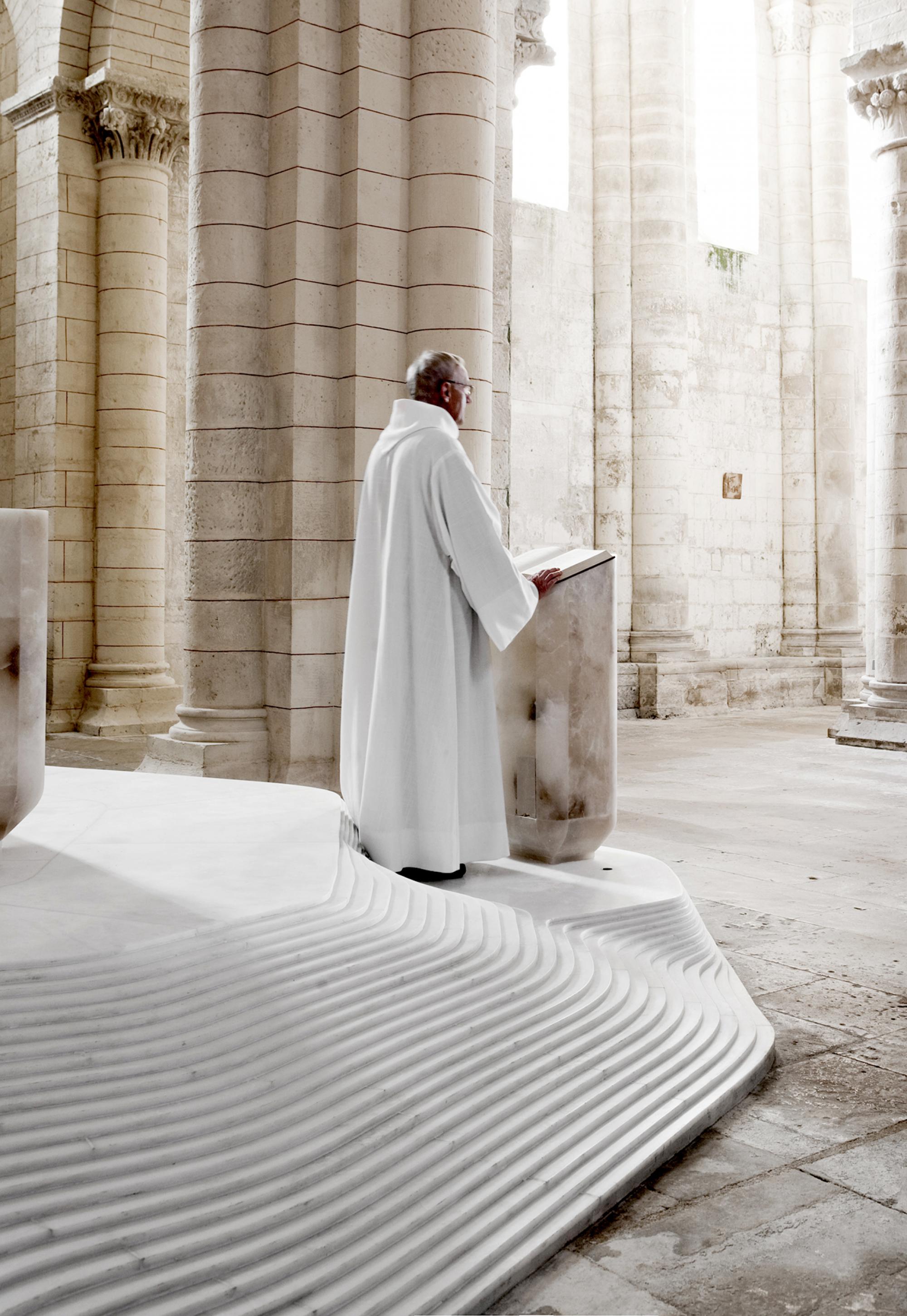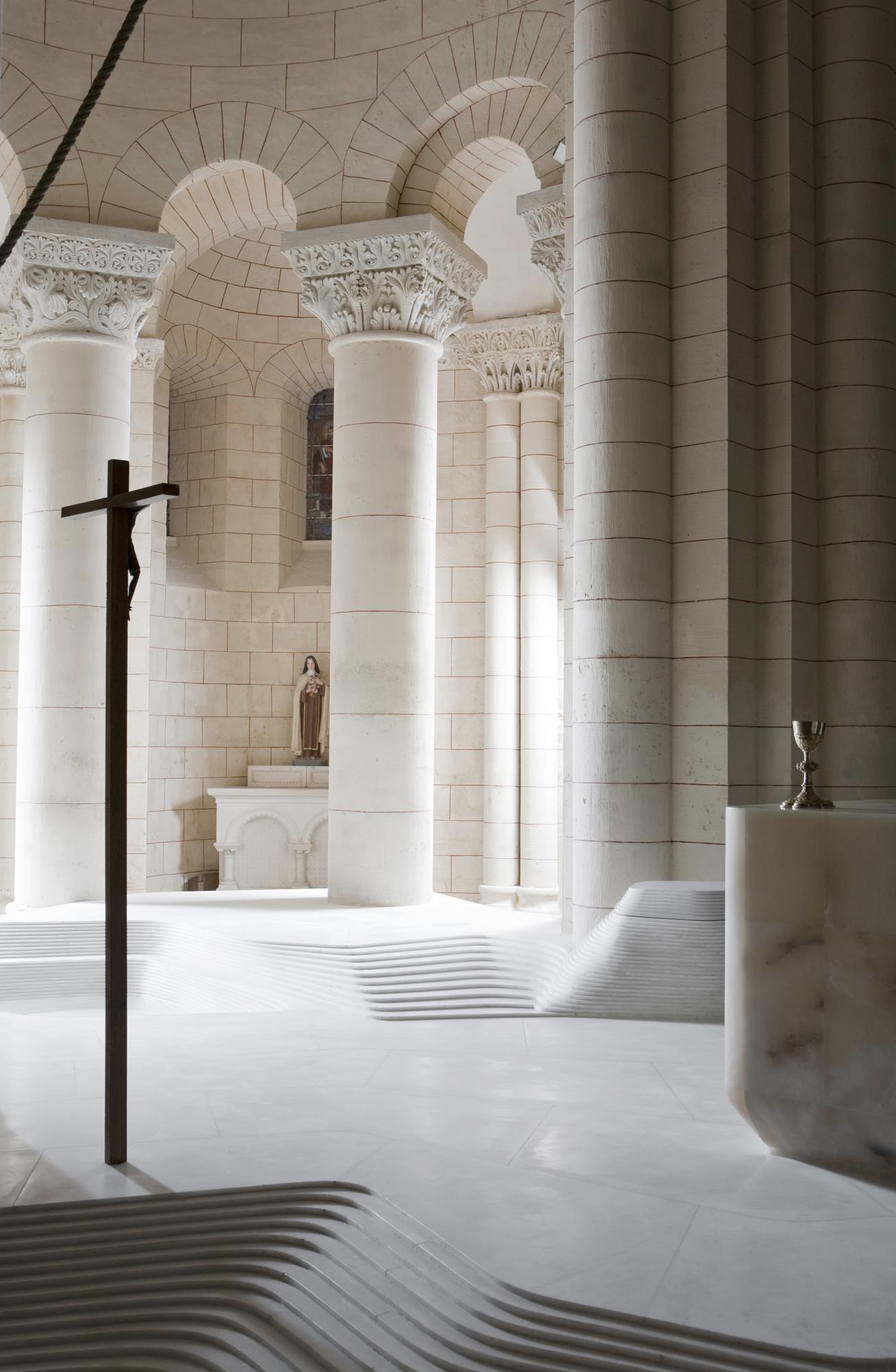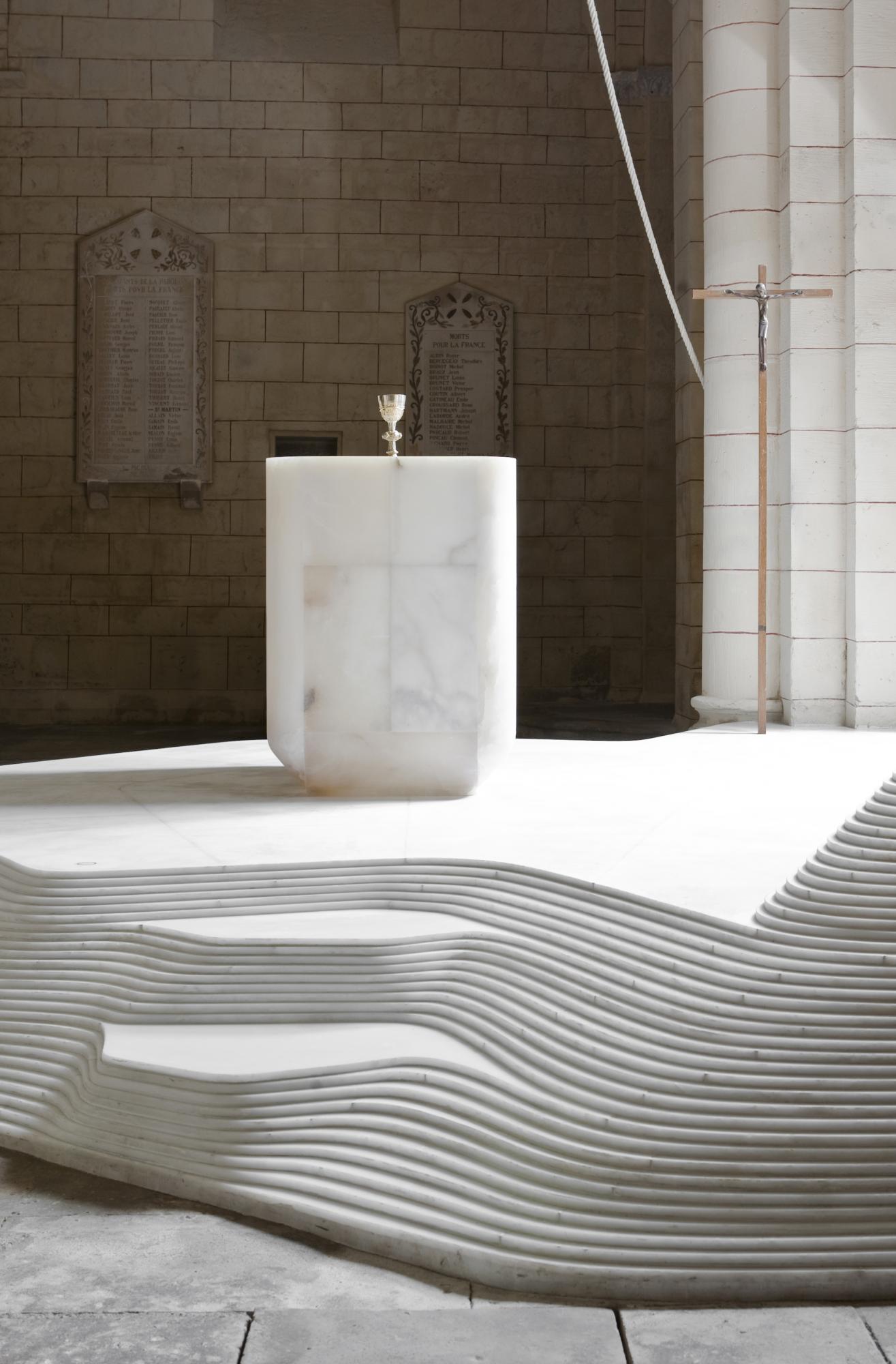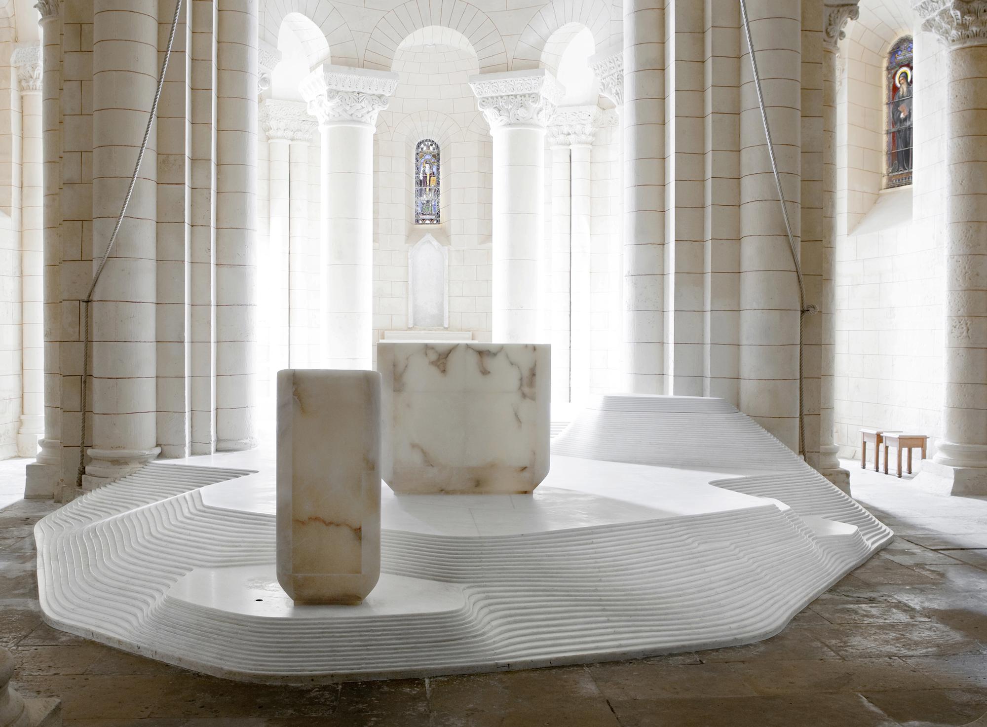 An architectural gesture equally paradoxical and strangely distinguishable which will undoubtedly mark an important milestone in the development of religious works. The white marble creates an homogenous mineral block formed from successive strata which seem to recall the sedimentary formation of the basement. The liturgical furniture (altar and ambo) is made from coloured alabaster, close to the colour of the original stone of the church. The result is a visual impact, one of Lehanneur's trade secrets, this time using the purity of the geological chaos to highlight the perfection of the Romanesque geometry.