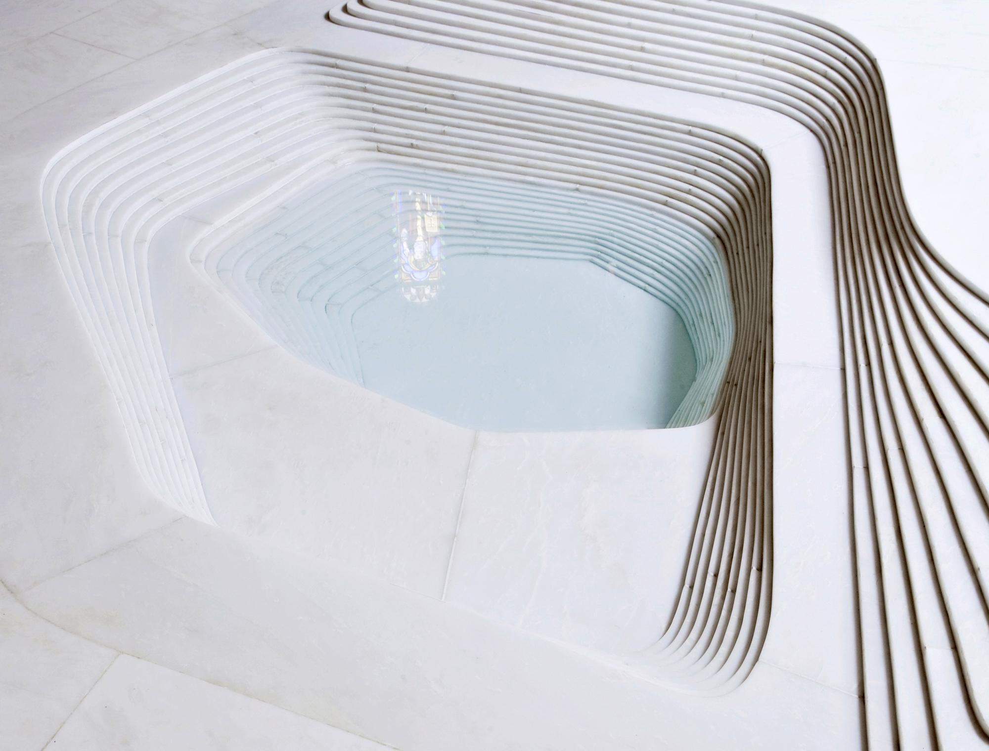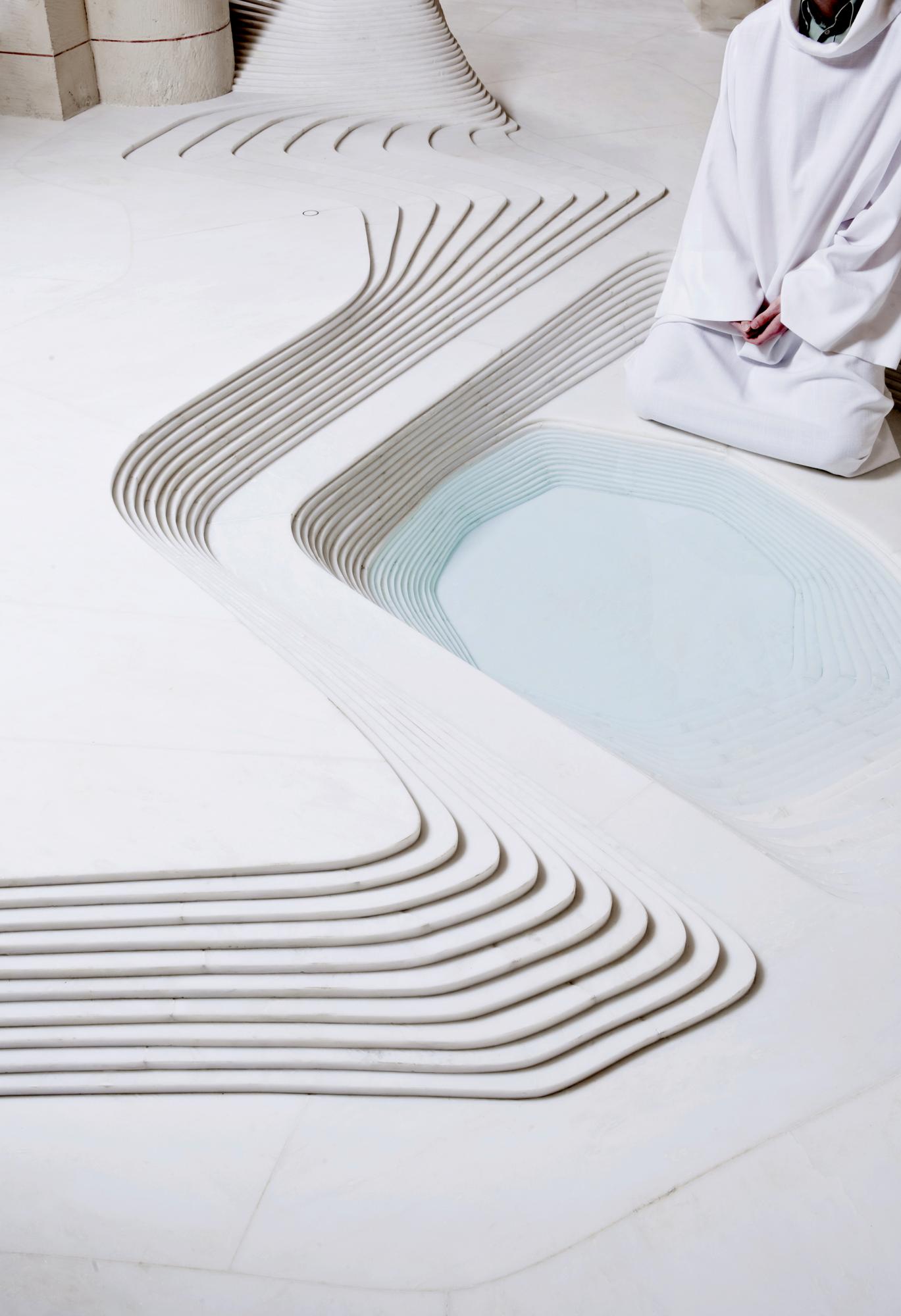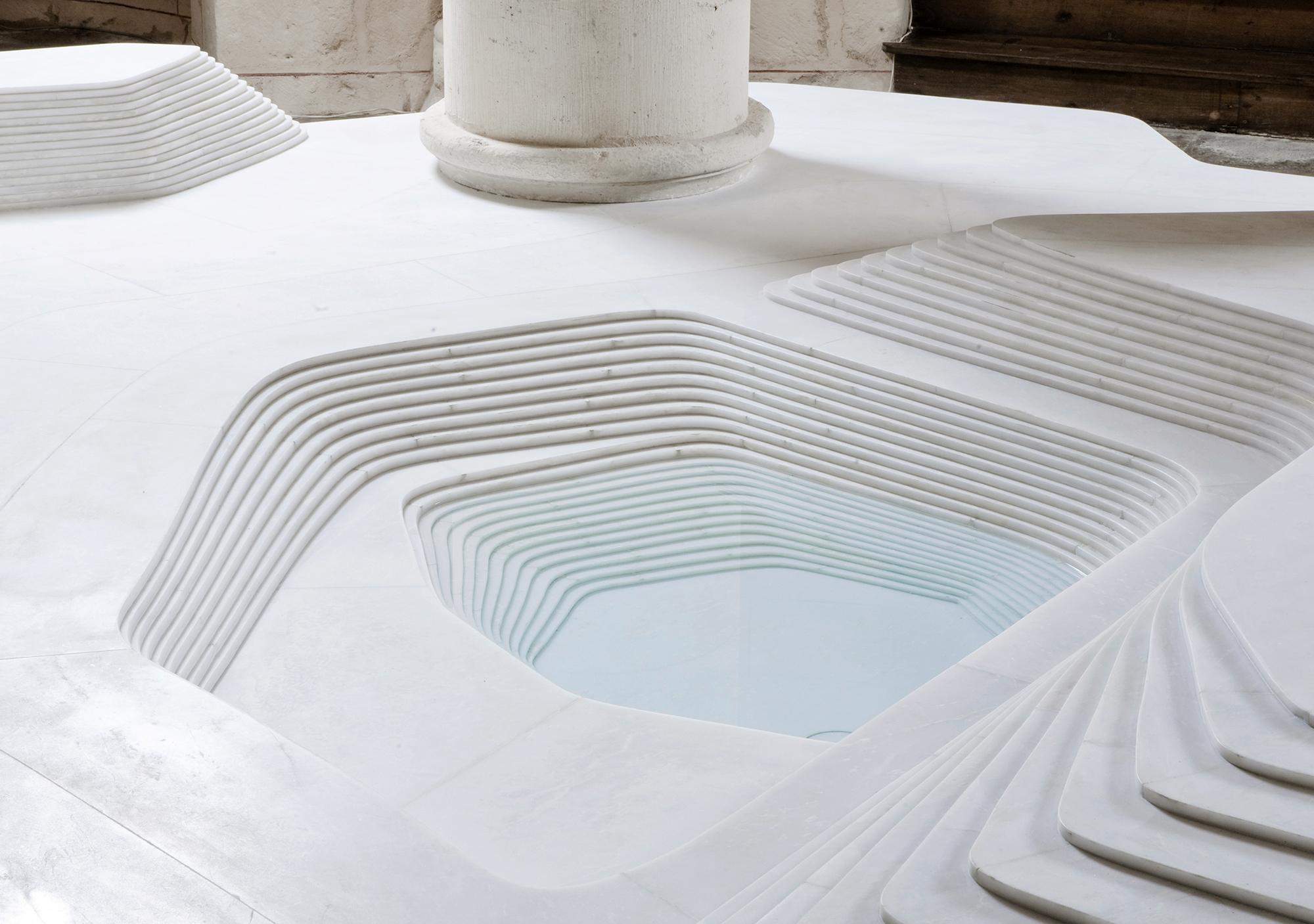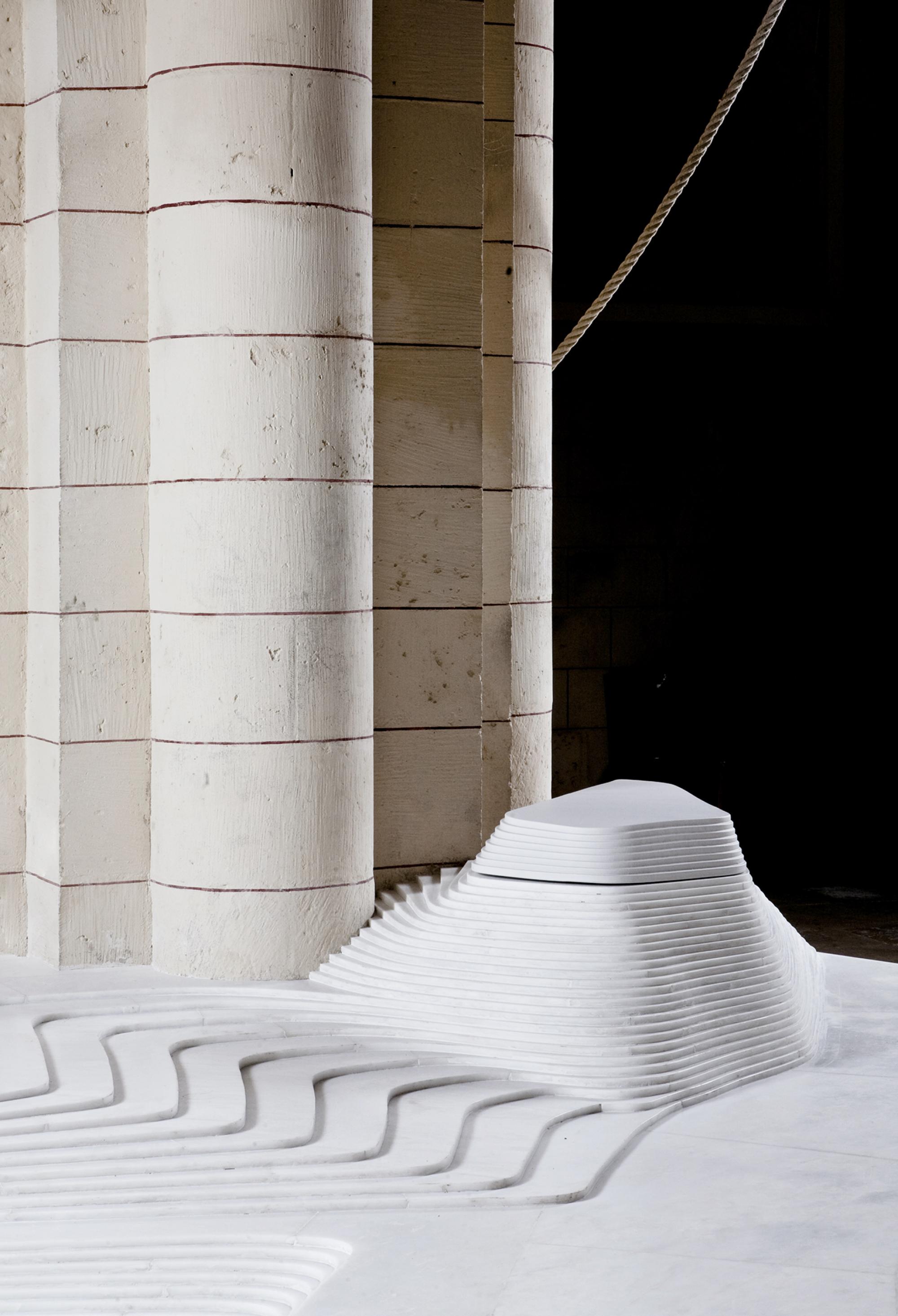 An architectural gesture equally paradoxical and strangely distinguishable which will undoubtedly mark an important milestone in the development of religious works. The white marble creates an homogenous mineral block formed from successive strata which seem to recall the sedimentary formation of the basement. The liturgical furniture (altar and ambo) is made from coloured alabaster, close to the colour of the original stone of the church. The result is a visual impact, one of Lehanneur's trade secrets, this time using the purity of the geological chaos to highlight the perfection of the Romanesque geometry.