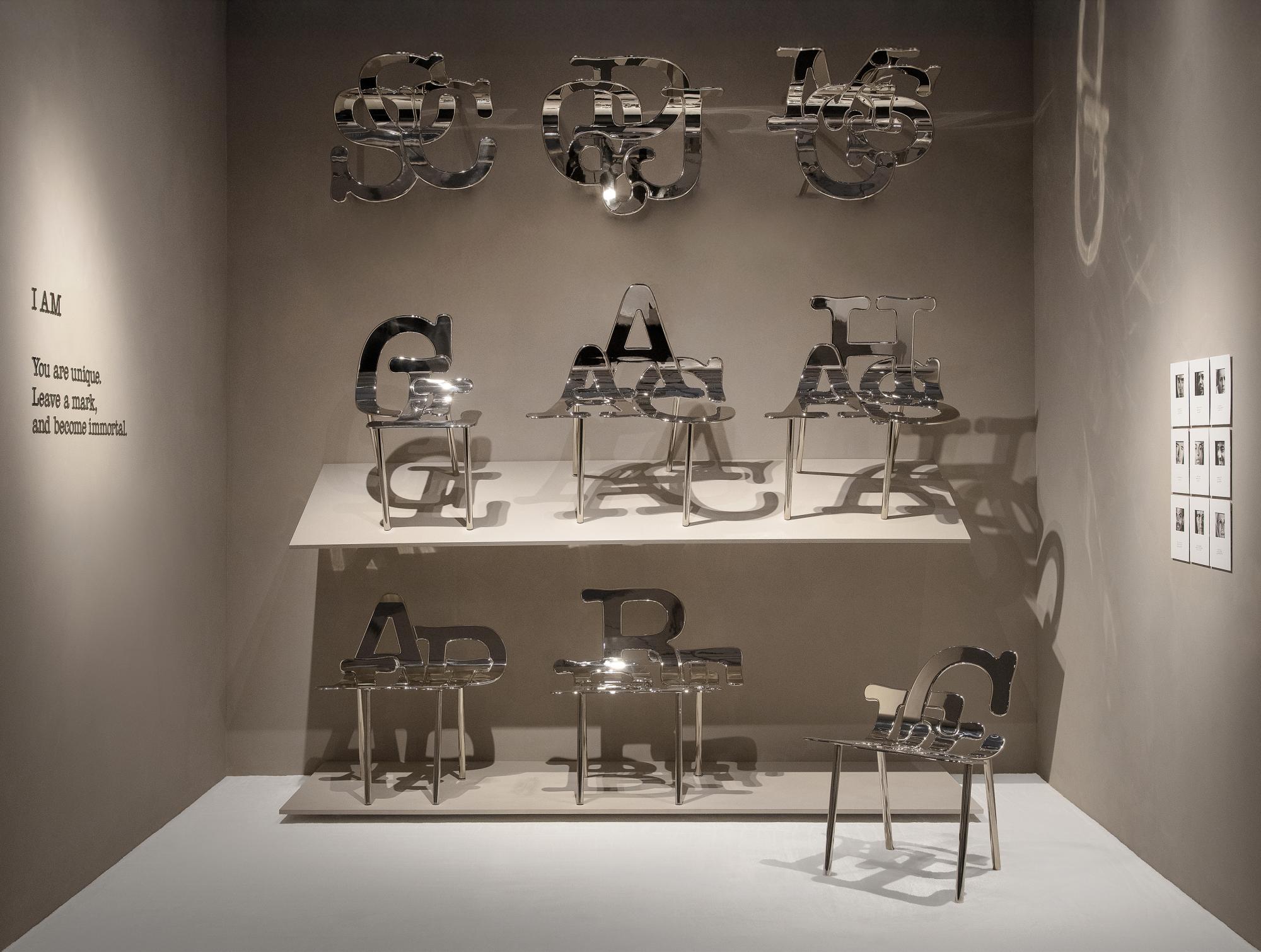 I am chair celebrates singularity. Each chair, custom-designed from our initials, becomes an individual coat of arms, the symbol of our existence. Made to order, each one in a one-of-a-kind piece crafted exclusively for its future owner. Created with two or more letters, it is shaped in aluminium, then finished in a nickel or copper plating. Just as every person is unique, each composition of initials for a chair is crafted only once, never to be replicated.