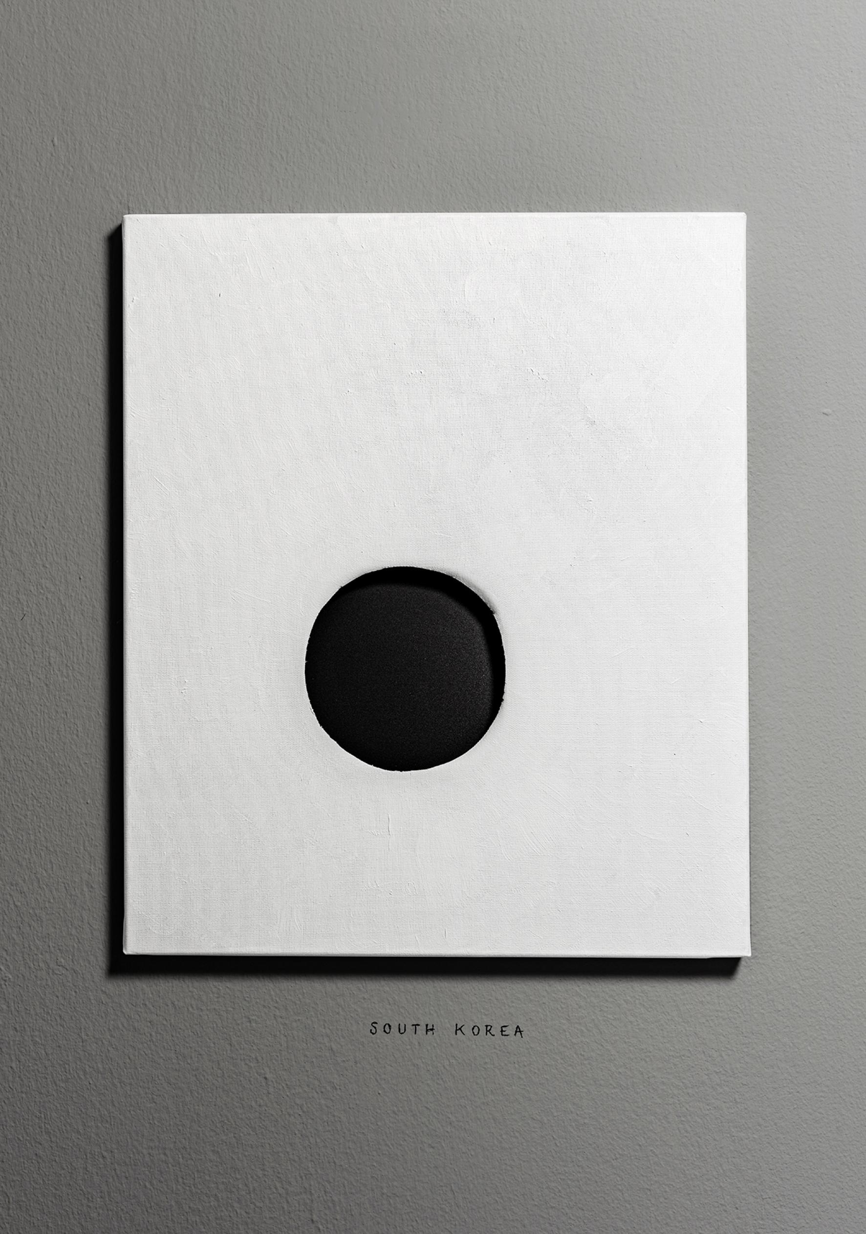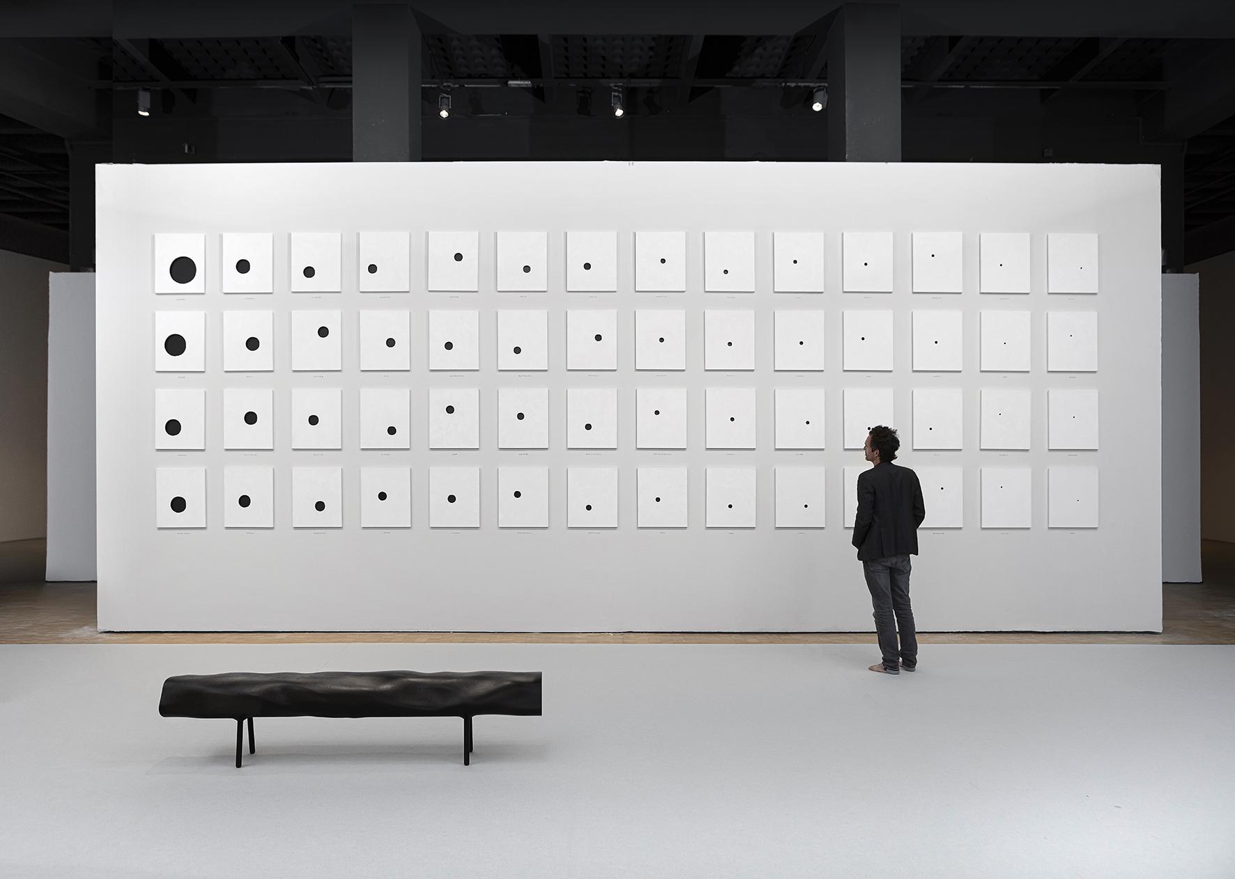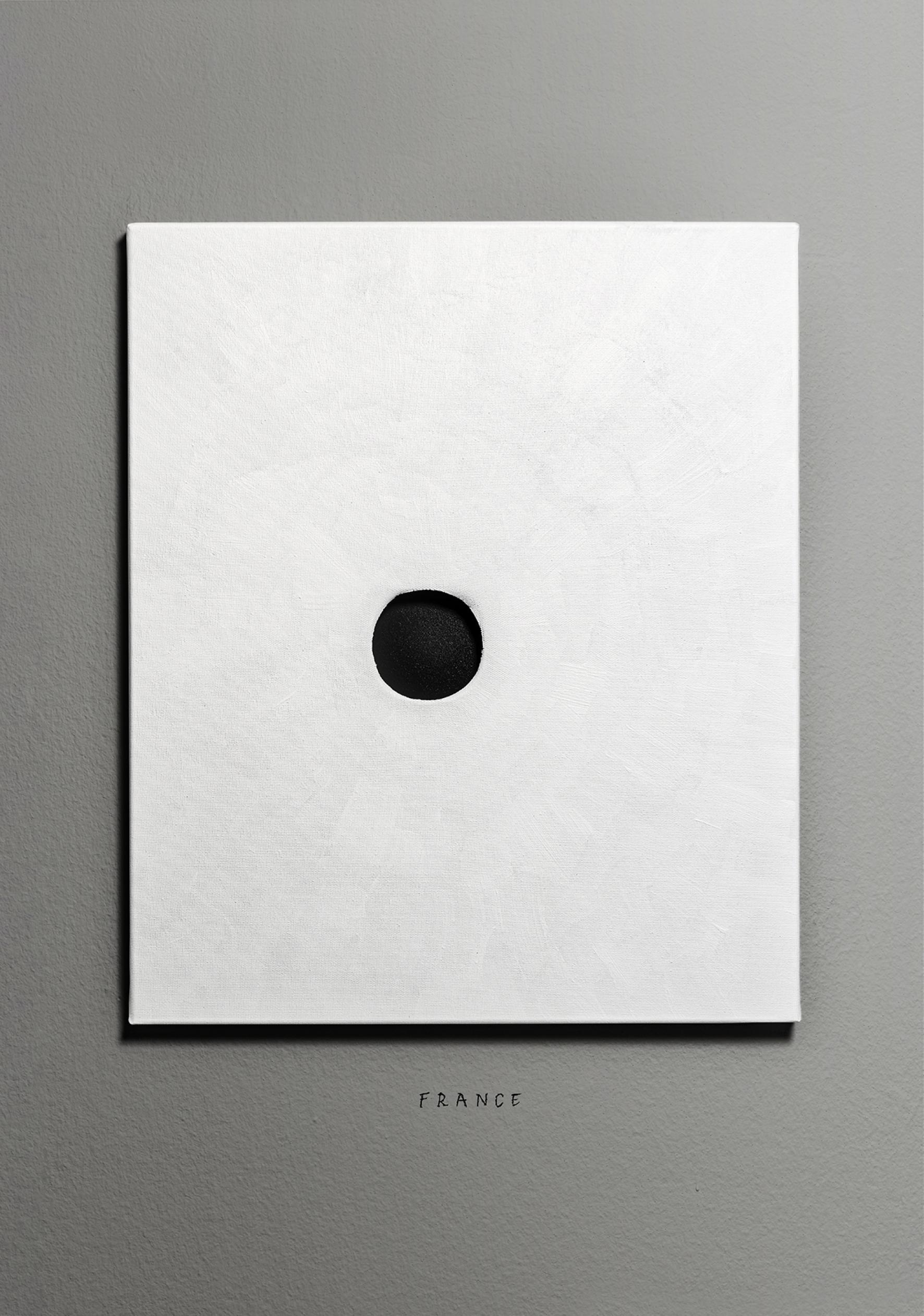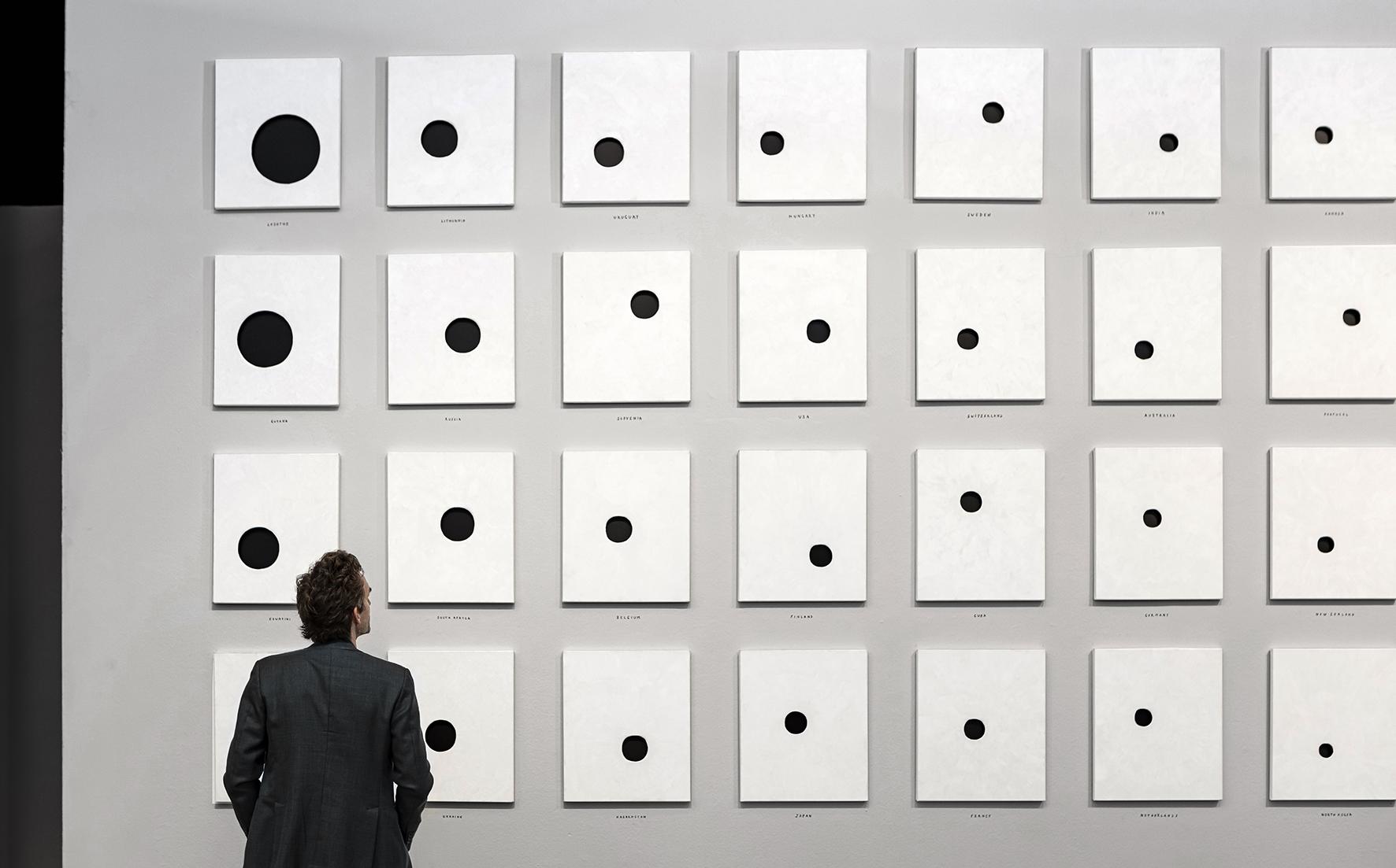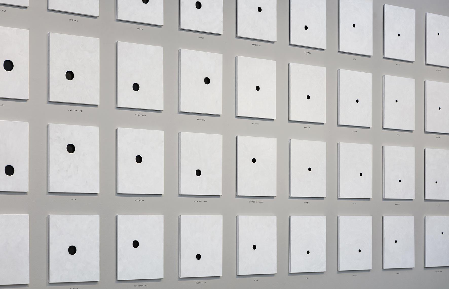 Based on global data provided by the World Health Organization, Live/Leave is a record of the state of our mental health through statistics showcasing suicide rates around the world. Highlighting individual choices, the installation could be interpreted as the state of happiness across the globe. There are obviously many disparities depending on the region, standard of living, age and gender of the individual, and each cause or circumstance of suicide could be analyzed rationally, but beyond the statistics, the issue of suicide confronts us with the fundamental question as posed by Albert Camus: "There is but one truly serious philosophical problem and that is suicide. Judging whether life is or is not worth living amounts to answering the fundamental question of philosophy. All the rest comes afterwards." In this collection of perforated blank canvases, the size of the black holes is defined according to the number of suicides per 100 000 inhabitants per country. The figures are thus converted into holes, translating a sense of absence. Live/Leave questions our desire to live through those who, every 40 seconds somewhere in the world, make a different choice.