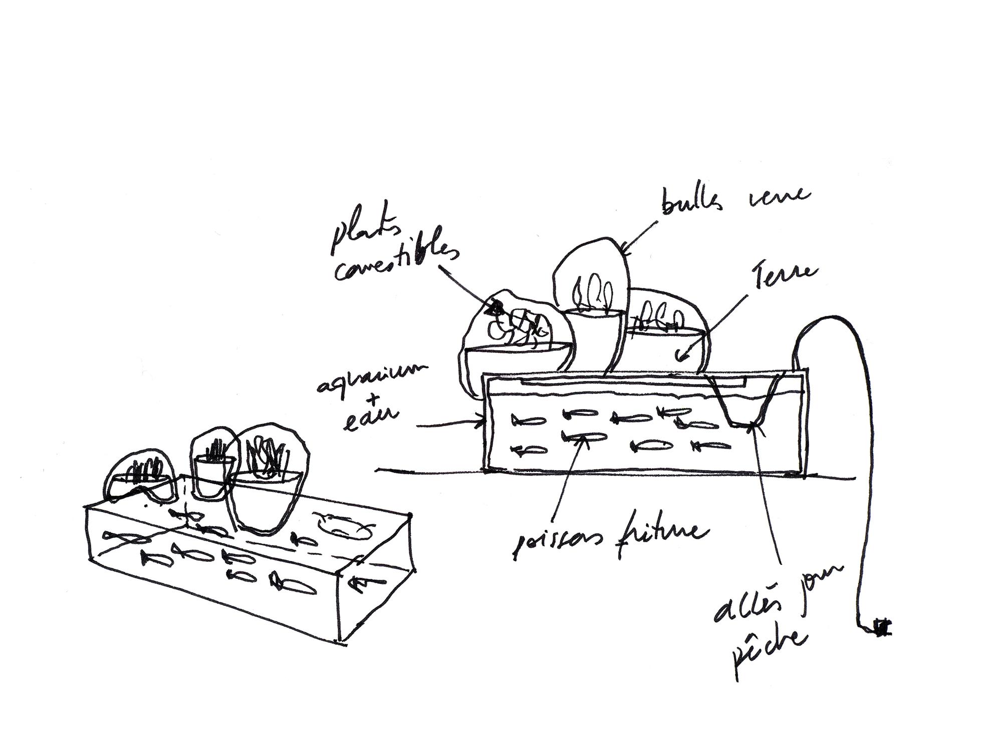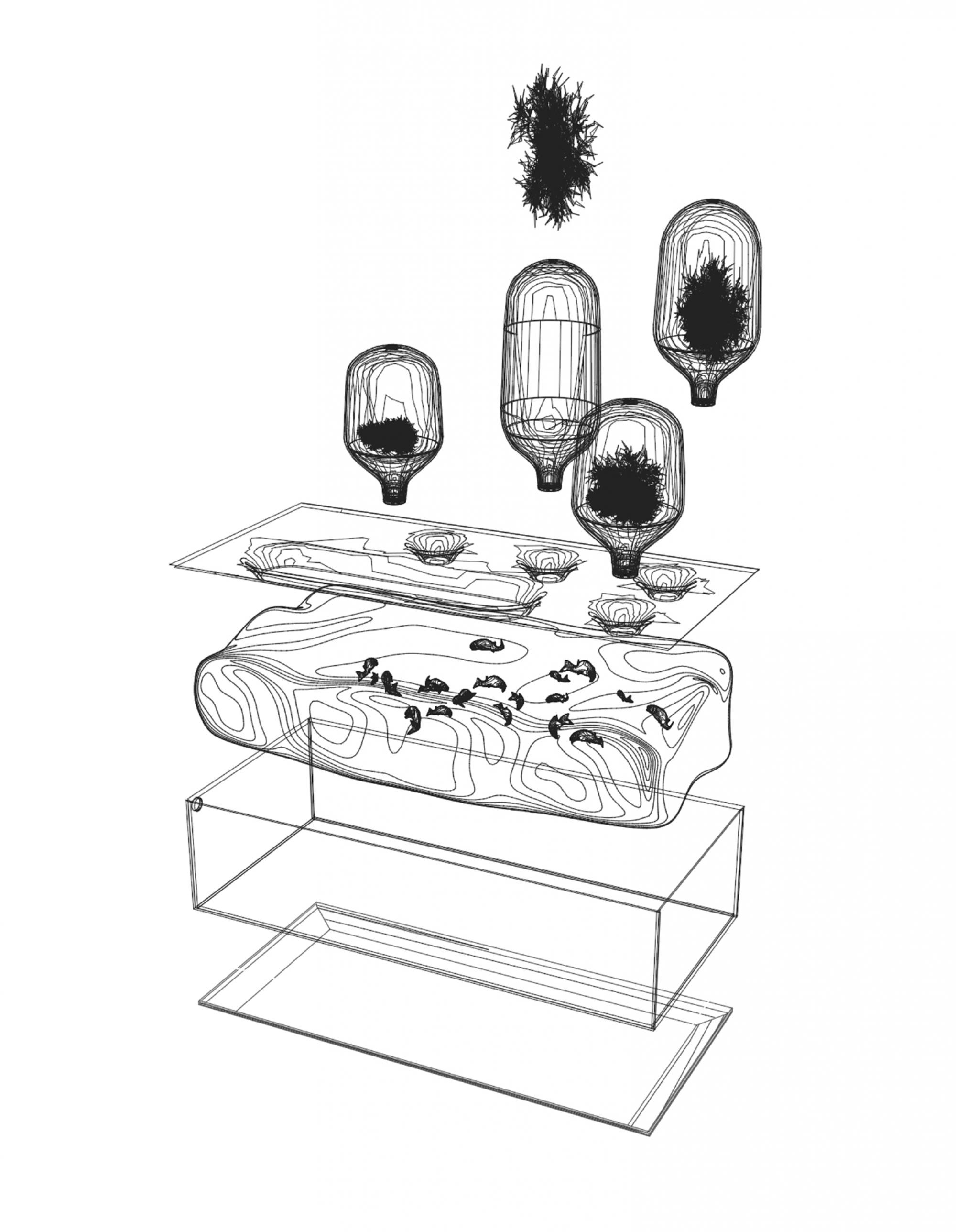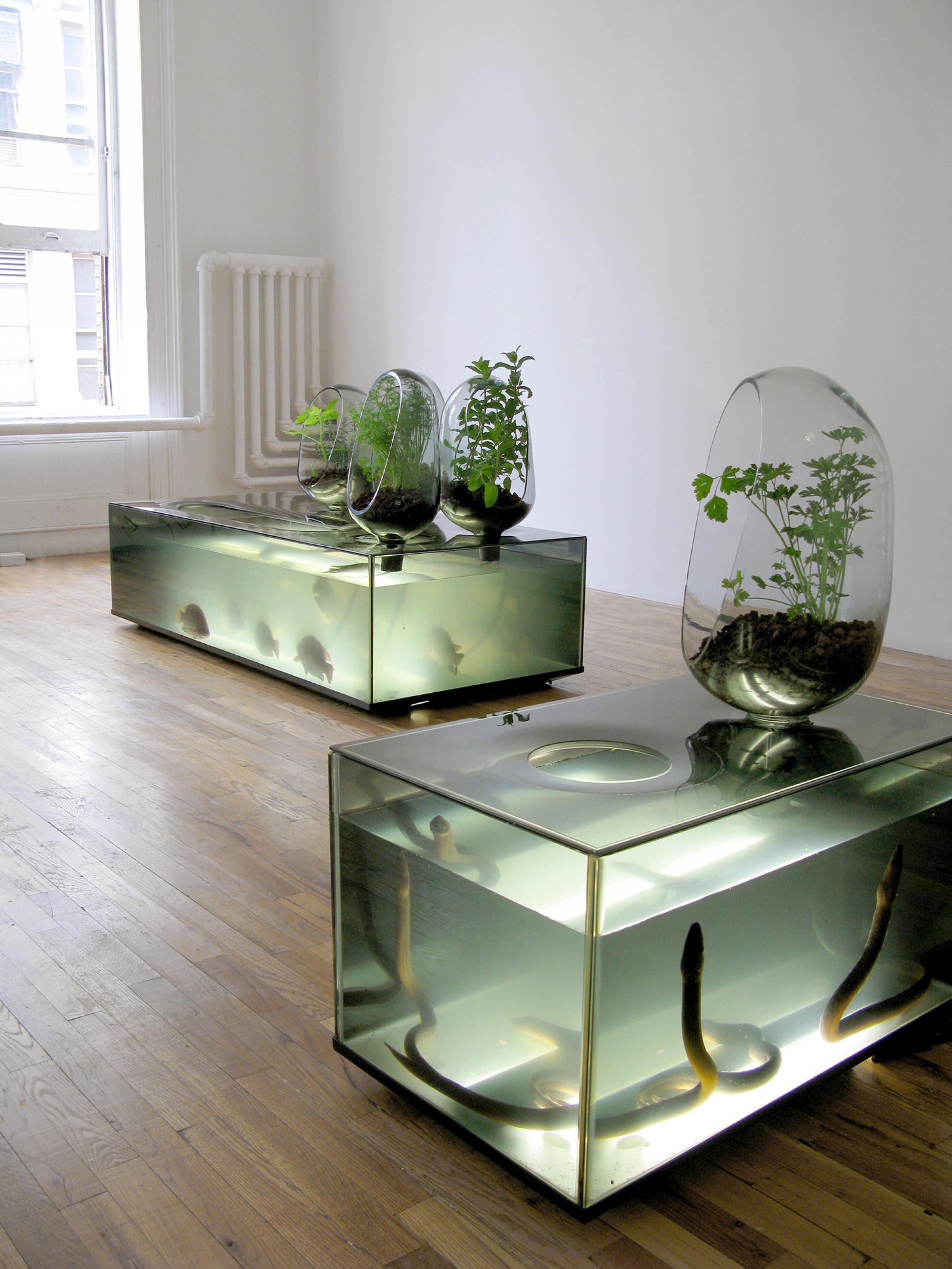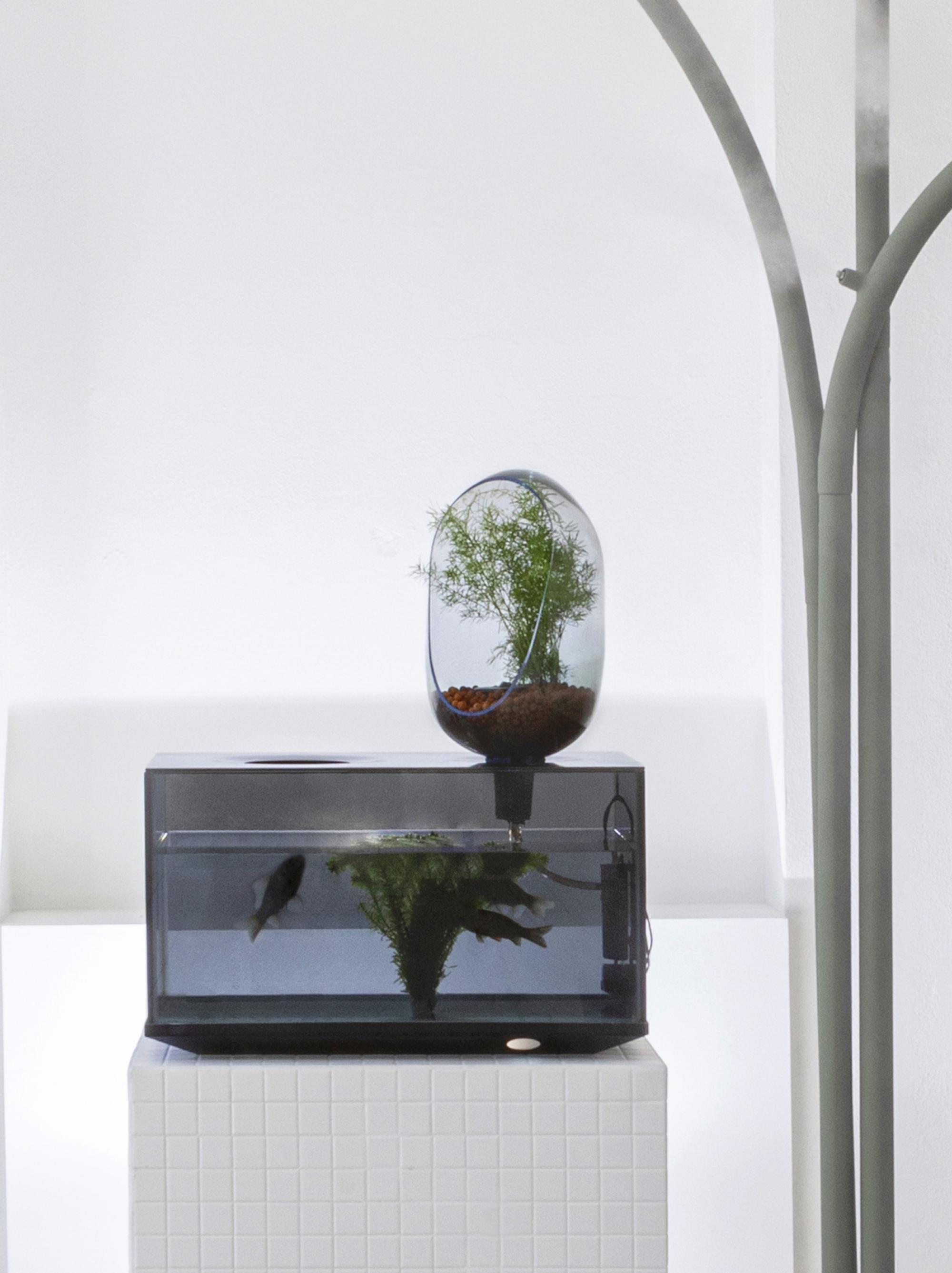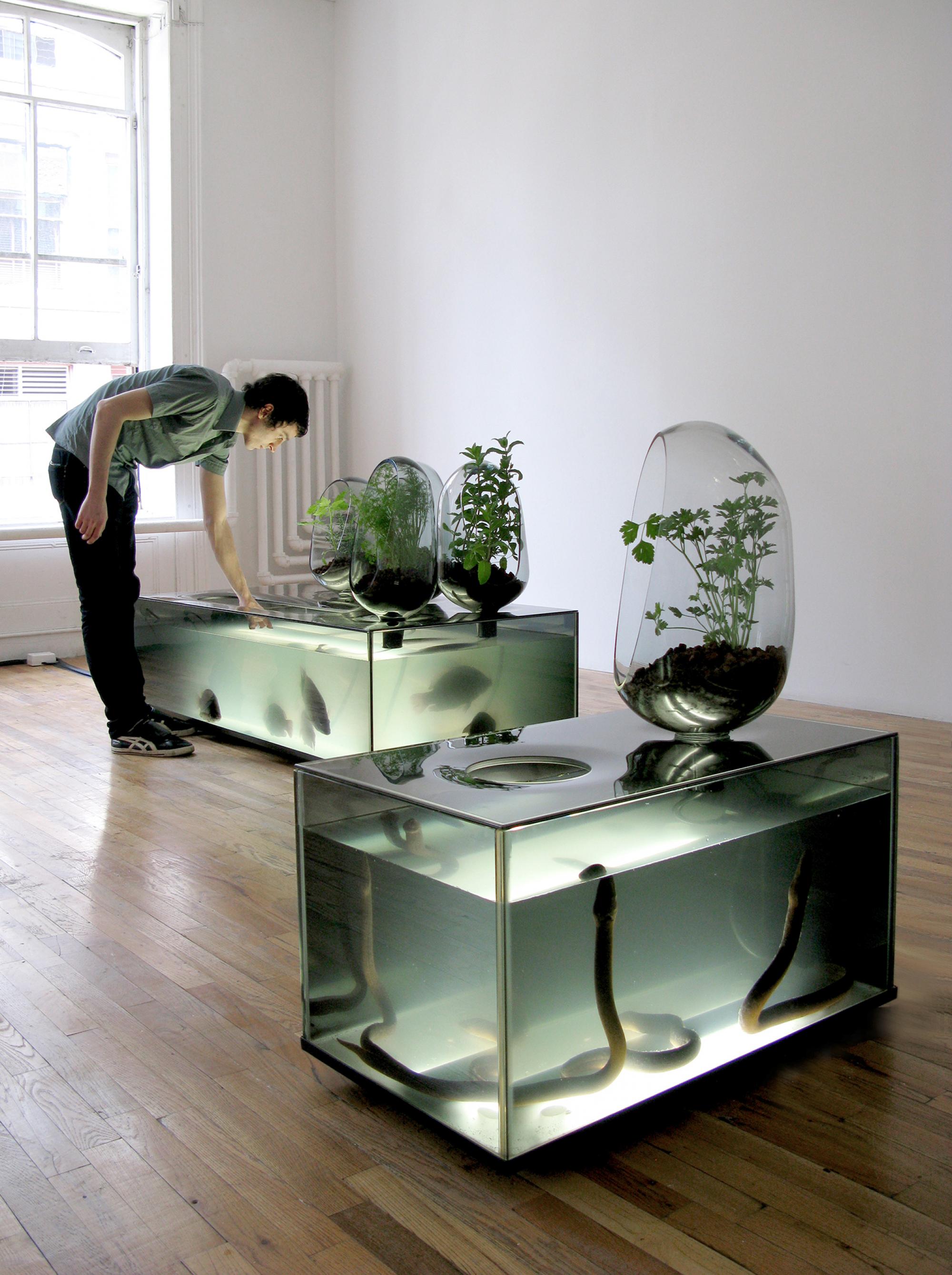 Local River aims to replace the decorative 'TV aquarium' by an equally decorative but also functional 'refrigerator-aquarium'. In this scenario, fish and greens cohabit for a short time in a home storage unit before being eaten by their keepers, the end-players in an exchange cycle within a controlled ecosystem.