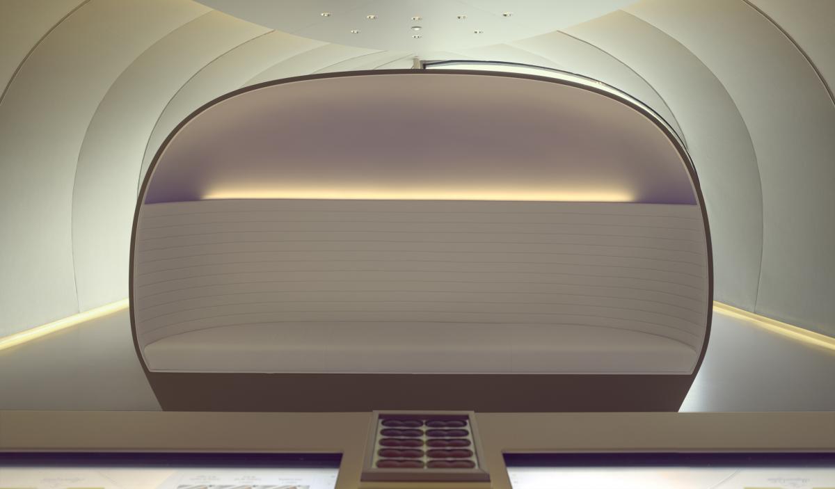 The entrance to the carapace, whose entrance is sliced as radically as a piece of Gruyère, the other regional speciality, visitors experience a sleek and streamlined interior. The laboratory protocol dear to the French designer sets the tone for an experiment for guinea pigs in the world of pleasure: 5 chocolate samples will reveal your preferences and your 'chocolate personnalities' to lead you towards the formulas which will most closely satisfy your stress-related food cravings. A test is also available online on the brand's website www.maisoncailler.com