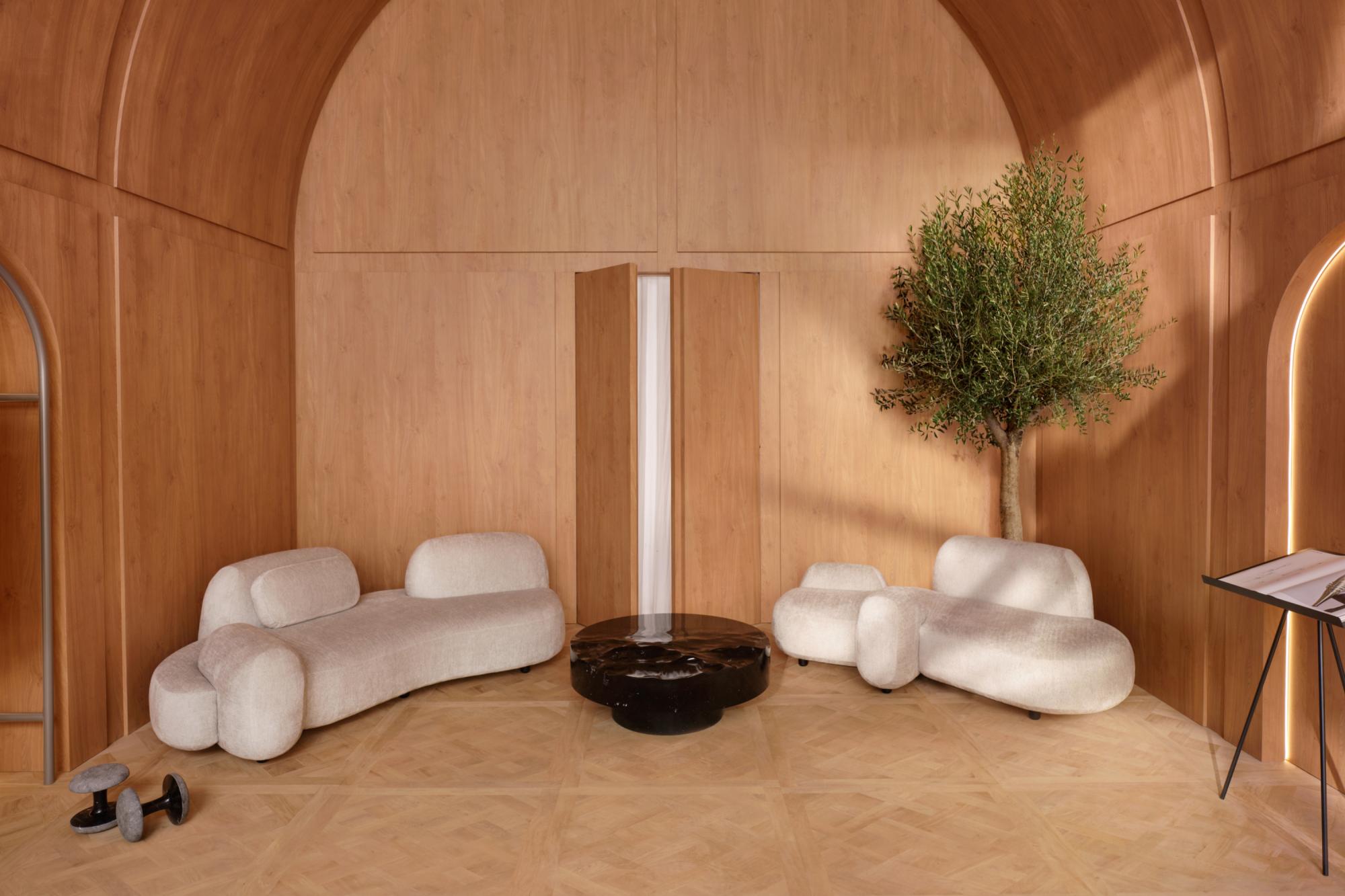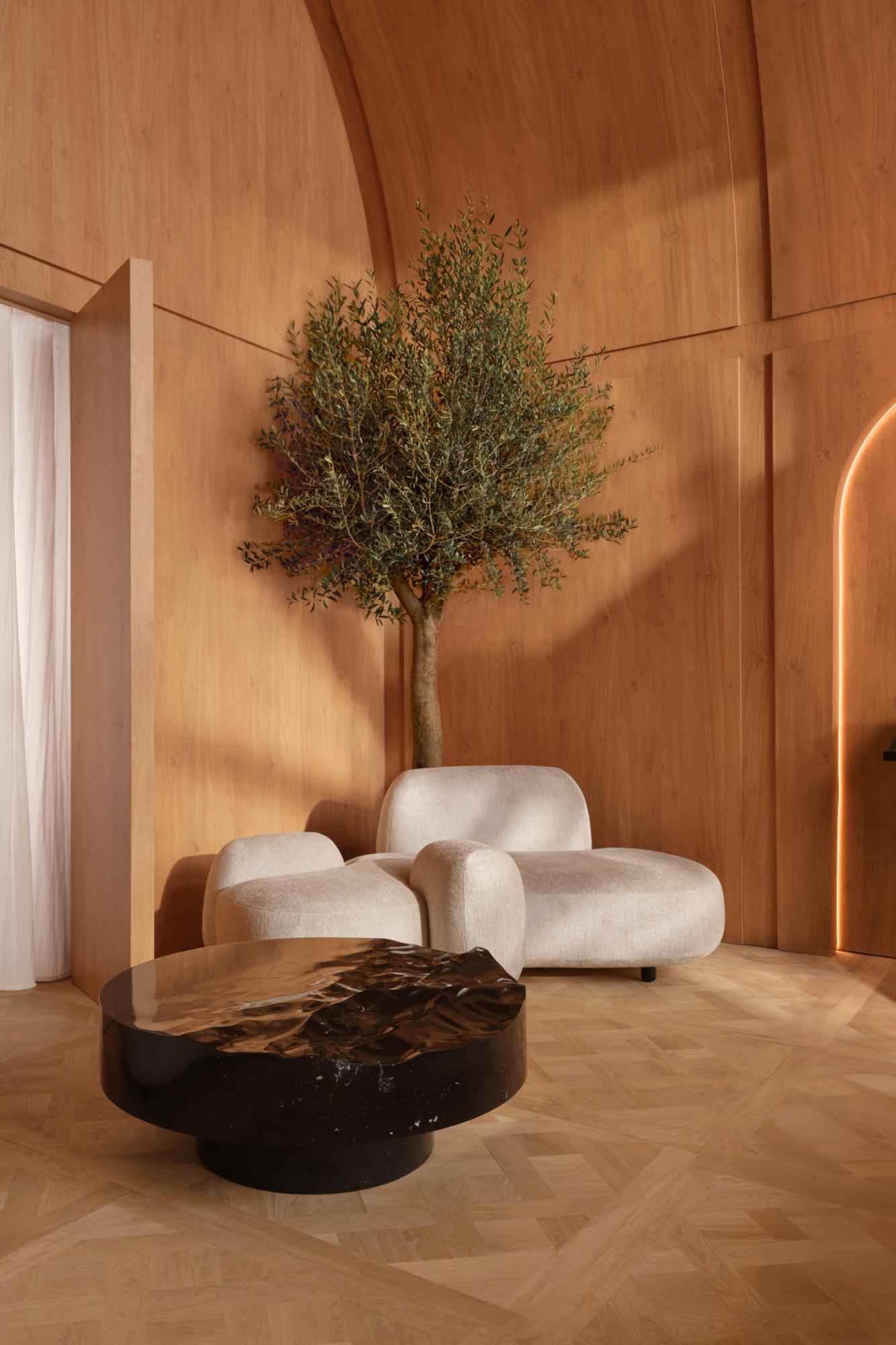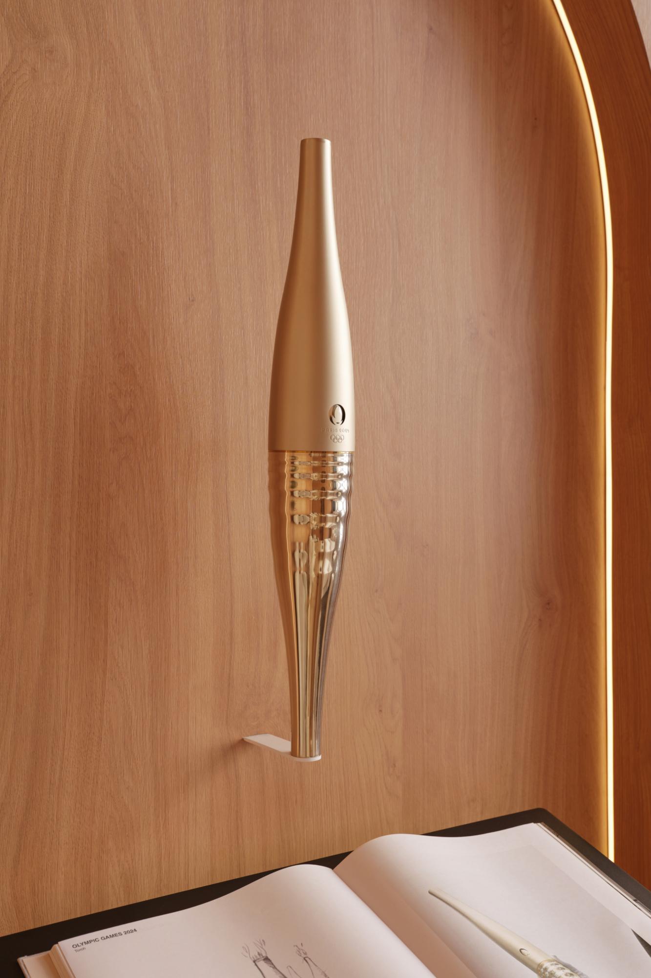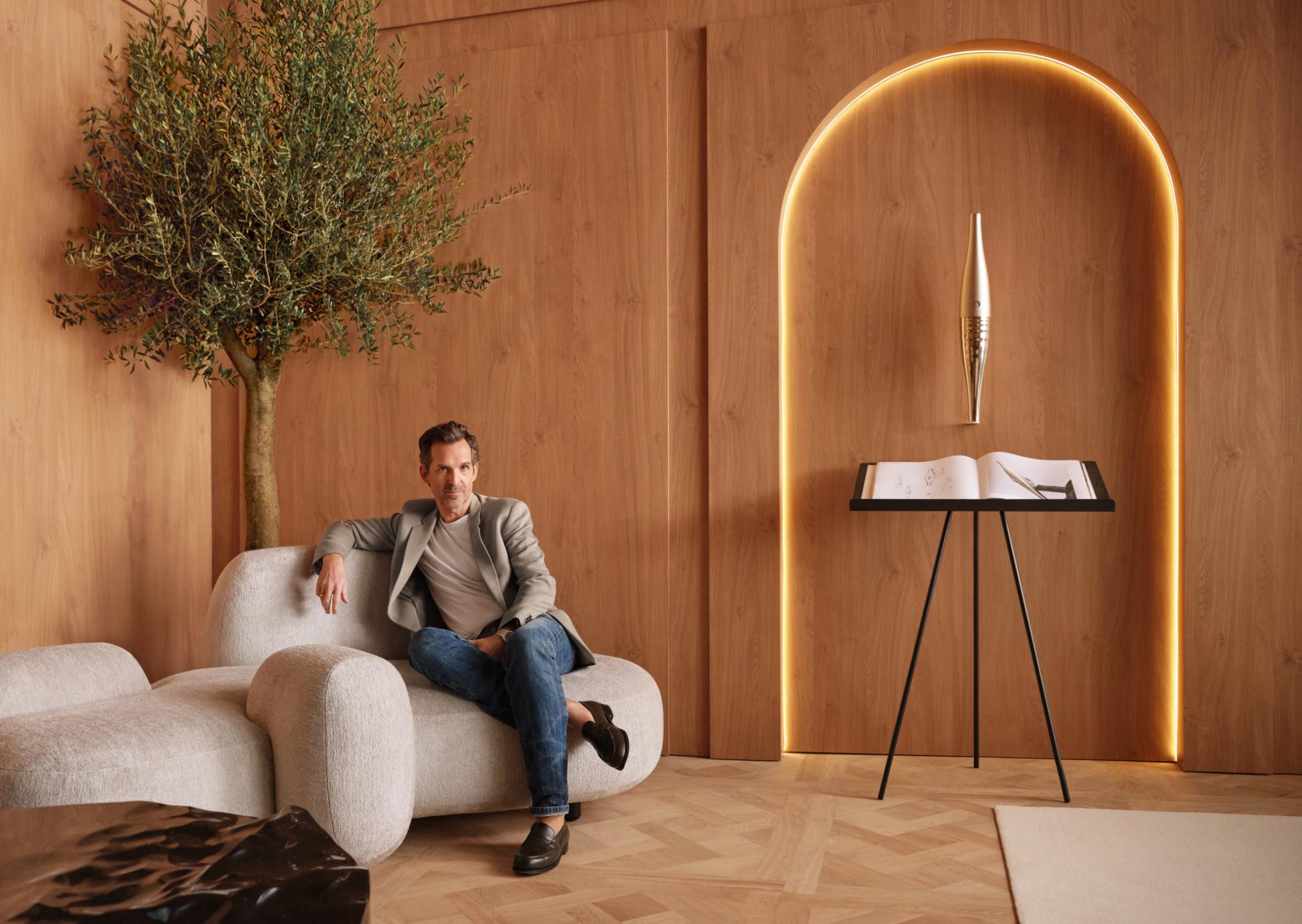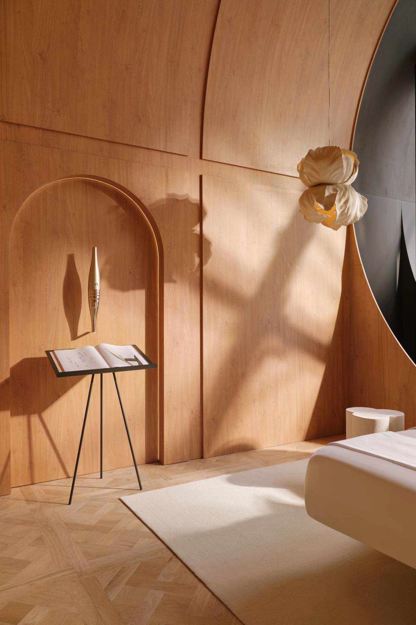 "Formerly a railway station in the heart of Paris 125 years ago, the Musée d'Orsay is now one of the finest museums in the world, boasting the largest collection of Impressionist paintings. All the original architectural features have been preserved, including the iconic and monumental clock visible from inside and out. For one night only, like a marvelous apparition, the Clock Room will become your bedroom. Adorned entirely in wood paneling, from the Versailles parquet floor to the vaulted ceiling, this space is designed as a daydream. The oversized glass and steel clock offer unparalleled views of the city, enhancing the beauty of the Parisian night. Your bed, suspended above the ground and the city, is the centerpiece. Two luminous ceramic flowers frame the headboard, while expansive, organically shaped sofas create a private lounge ambiance. Included in the decor is the torch I designed for Paris 2024, displayed in its dedicated alcove, facing a padded punching bag for a personal sporting touch so that you can take part in the competition yourself! Since the most beautiful room must have the most beautiful balcony, the Museum's large terrace will also be reserved for you. Paris is yours; the Ceremony can begin..." ML
