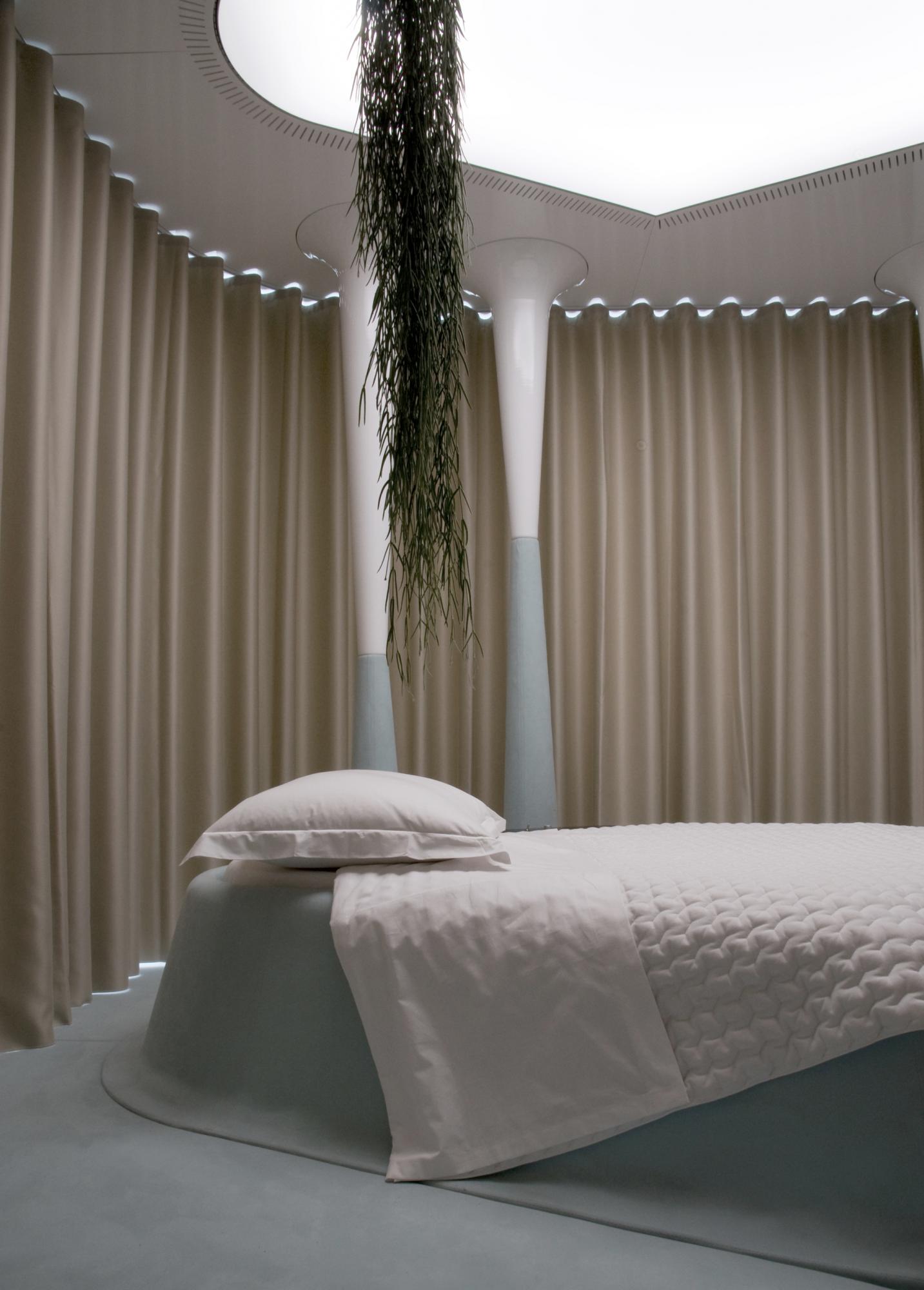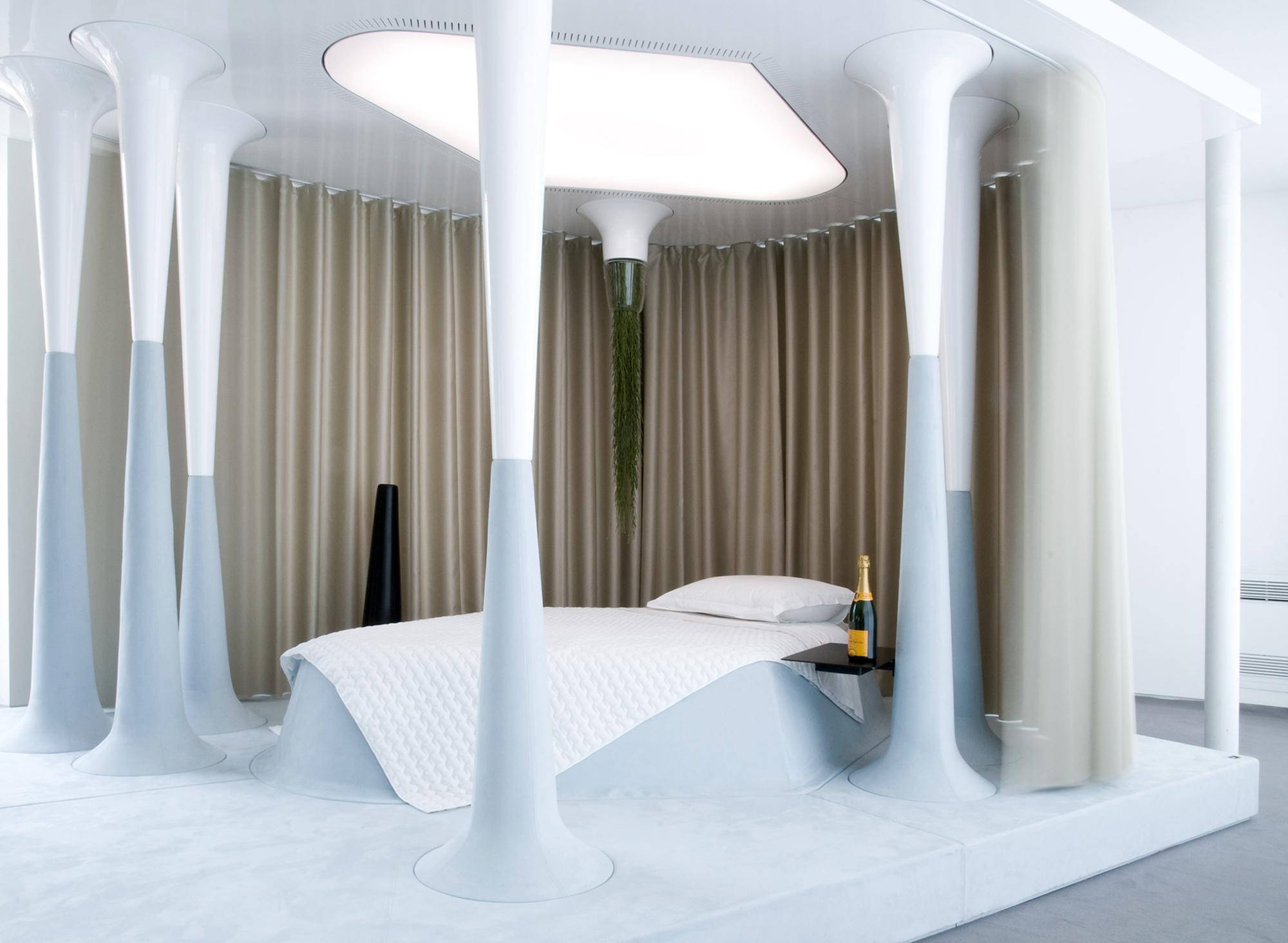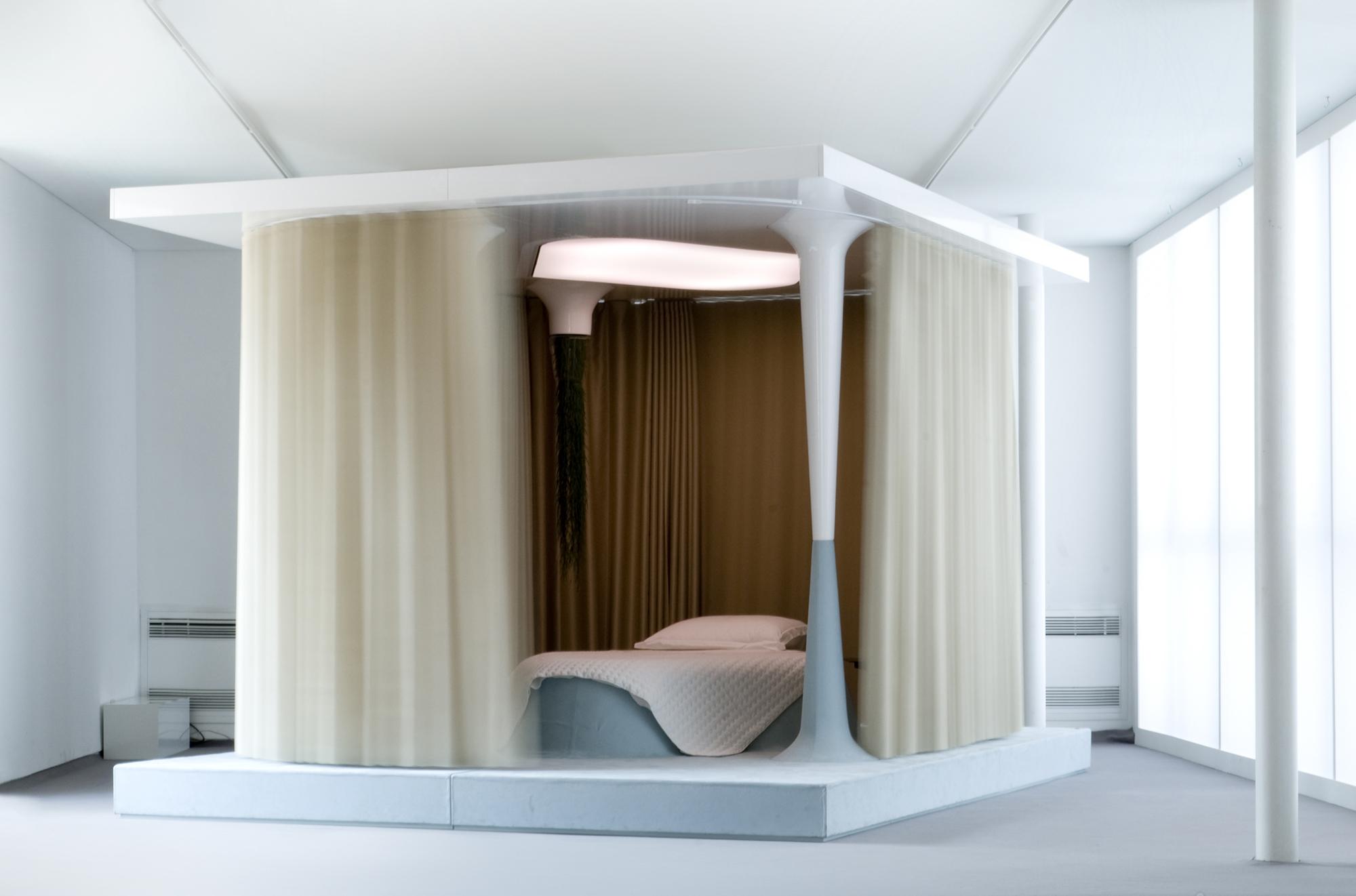 Once Upon a Dream is a space for sleep recovery. An hybrid object between a four-poster bed and a bedroom, between a fairy-tale and science-fiction, this project is based on physiological studies of sleeping disorders, and in particular insomnia. A reference to the History of the House, as Veuve Cliquot was herself a notorious insomniac.The principal rests upon the artificial and programmable management of natural day-night cycles. This bedroom-capsule indeed integrates light, sound replique hublot and temperature variation programmes from amongst the powerful stimuli taking our organisms from activity to rest; from objective reality to the deepest dreams.